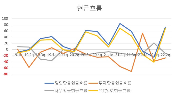 현금흐름은 대체적으로 좋다. 영업 관련 지표와 마찬가지로 21년 4분기와 22년 1분기에 현금흐름 지표가 좋지 않았던 이유가 무엇이었는지 파악이 필요하다.