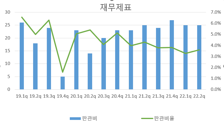 -> 판관비는 비슷하게 유지되지만 판관비율은 줄어들고 있다. 좋은 징조이다.