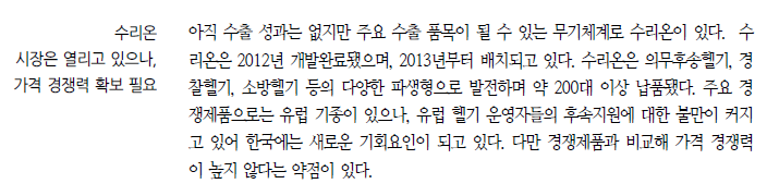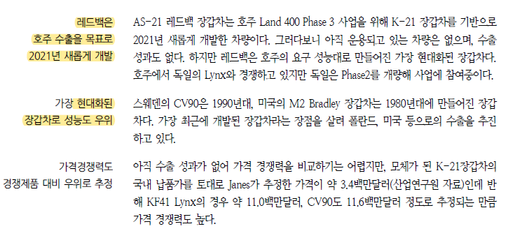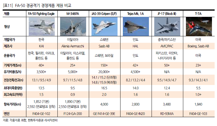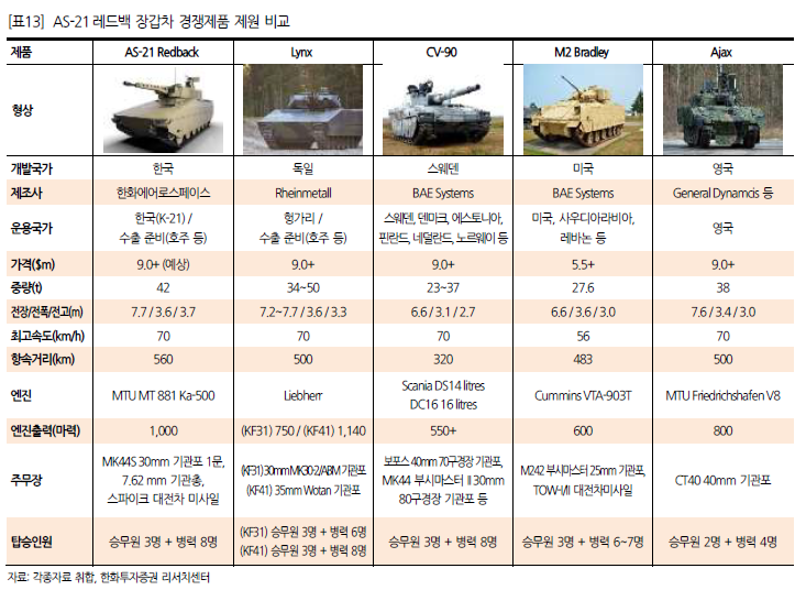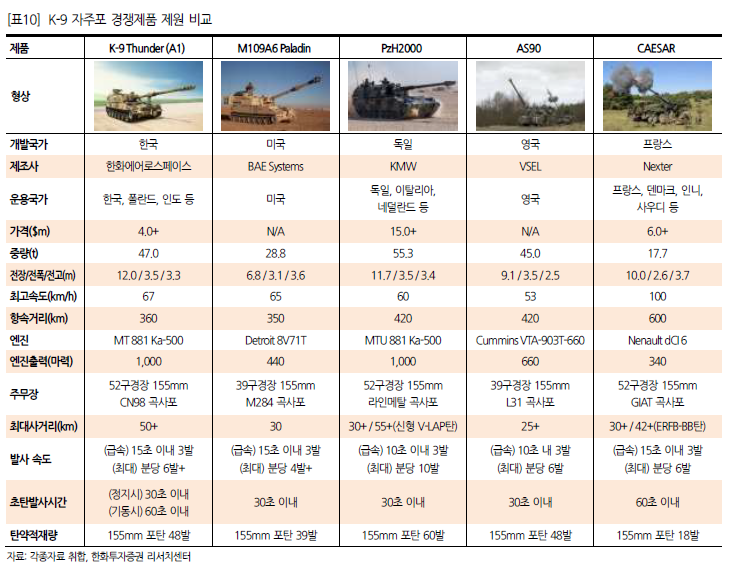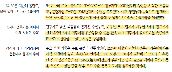 이들 주력 수출 무기를 해외 경쟁 제품과 비교해본 결과 가격 경쟁력과 운용대수 등의 측면에서 우리 무기의 수출 경쟁력이 우위에 있는 것으로 판단된다. 특히 K-9 자주포의 경쟁력이 가장 높았고, FA-50도 경쟁 기종 대비 운용대수에서 우위에 있었다. 레드백도 가장 현대화된 장갑차이며, 천무는 경쟁제품의 단종으로 비교 대상이 없다. 천궁II는 가격 경쟁력 면에서 경쟁제품 대비 우위에 있다.
