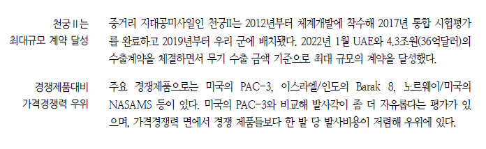 2022년 12월 발표된 ‘23~’27 국방중기계획에서도 변화하는 전장환경에 맞춰 AI 기반 유·무인 복합전투체계를 개발하고 발전시키기 위한 항목들이 포함됐다. 한반도 주변에 대한 감시능력을 높이기 위해 정찰위성과 초소형위성체계 등을 늘려가는 한편, 무인기와 정밀 유도무기 등을 다양화해 전력화할 계획이다. 하지만 우리나라의 무인체계는 국방중기계획에서도 개발에 방점을 두고 있다. 유도무기 가운데 천궁은 UAE와 수출 계약을 체결했지만, 우리나라의 주력 수출 무기는 첨단무기라기 보다는 전차, 자주포, 장갑차와 같은 재래식 무기 중심이다. K-방산의 수출 경쟁력을 짚어보려면 첨단무기보다는 재래식 무기에 초첨을 맞출 수 밖에 없는 이유다.