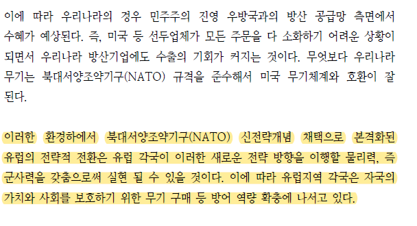 요즘 방산이 좋다는 이야기가 좀 들리길래 산업 리포트를 읽고 의미가 있다고 생각되는 내용을 정리해봤다. 리포트에서 그대로 복사한 글은 이 양식으로 표시할 예정이다. 참고한 회사의 리포트는 IBK, 하이투자증권, 다올, 한화투자증권이다.
