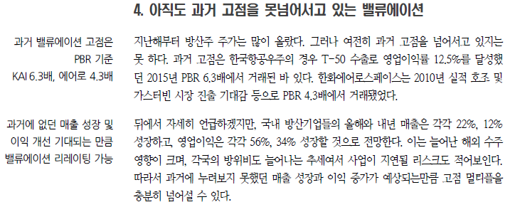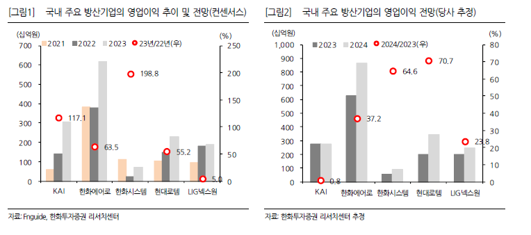 우리는 방위산업에 대해 Positive 의견을 유지한다. ①해외 수주 확대로 실적 개선이 본격화된다는 점이 가장 중요한 투자포인트이며, 추가적인 수주는 ‘+α’가 될 것이다. 올해와 내년의 방산업체 합산 영업이익은 각각 56%, 34% 증가할 것으로 전망한다. 또한 ②방산 수출을 뒷받침할 수 있는 민수부문이 개선되고 있는 점도 주목해 봐야 한다. 한화비전의 성장세가 계속되고 있으며, 기체부품도 항공 여객 수요 회복과 함께 10년치이상의 수주잔고가 쌓여있어 성장 잠재력이 높다. ③꿈을 먹고 사는 분야 우주산업도 군사용 시장을 중심으로 사업들이 구체화되고 있다. ④실적이 개선됨에도 밸류에이션은 과거 고점을 못넘어서고 있어 현저한 저평가 상태라 판단한다. ⑤경기침체가 우려되는 시기지만 매출 성장과 이익 개선이 타 업종보다 확실시된다는 점도 매력적이다.