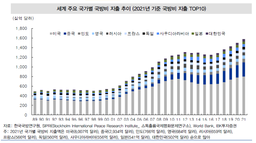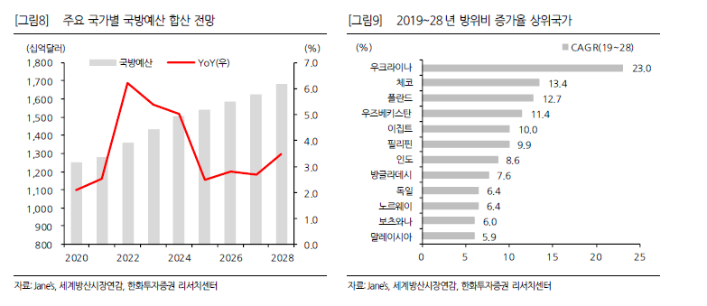 2022년 전세계 방위비는 2021년 대비 3.7% 증가했다. 우크라이나, 러시아, 폴란드 등의 방위비가 큰 폭으로 증가했고, 나토 회원국들도 방위비를 늘리고 있다. 과거 냉전시기 GDP 대비 방위비 비중은 4%였는데, 현재는 2.3%로 줄었다. 영국 군사정보 컨설팅업체 Jane’s 에 의하면 2025년까지 주요국 방위비는 연평균 5% 이상 증가할 전망이다.