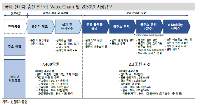 - 2030년 기준 시장규모는 충전기 제조업 7,400억, 충전 인프라 사업 2.2조원 전망