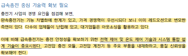 - 완속 충전기는 기술 차별에 한계가 있고 가격 경쟁력이 우선시되다 보니 이미 레드오션이다. 이에 비해 급속충전기는 충전 안정성을 확보하기 위한 전력 제어 및 온도 제어 기술과 시스템 통합 설계기술이 중요시되어 어느 정도의 기술문턱이 있는 상황이다. 현재 제조 업체로는 SK 시그넷 , LG 전자 애플망고 LS ELECTRIC, 대영채비 중앙제어 코스텔 에버온 씨어스 등이 경쟁중이다.