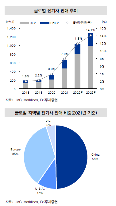 - 글로벌 전기차 판매 비중은 2023년에 14%로 예상된다. 판매 비중은 중국(50%), 유럽(35%), 미국(10%) 순이다