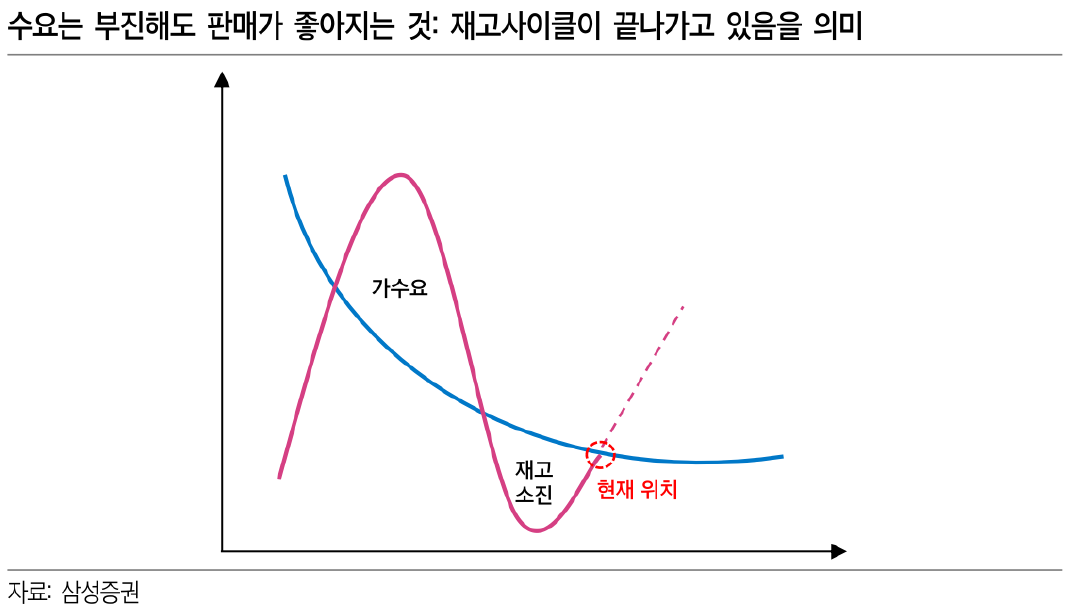내년 생산이 업체별로 차이가 있겠지만 평균적으로는 한 자릿수 중반 %를 넘지 못하고 수요가 10% 이상 개선된다면(고객의 재고 소진 이후라 가능해보인다), 재고는 내년 중반 이후 정상화로 갈 수 있다.
