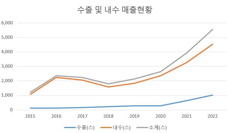 스크린골프 사업부분의 수출 및 내수현황을 뽑아보았다. 국내 시장점유율은 60~70%대로 정체중인데 내수매출은 계속해서 증가세이다. 스크린골프 내수시장 자체가 커지고 있는 것으로 보인다. 수출은 내수에 비해서는 작은 금액이지만 20년 이후로 증가하는 모습을 보이고 있다.