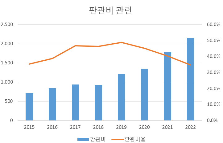 판관비는 지속적으로 늘어나지만 판관비율은 오히려 감소하는 좋은 모습을 보이고 있다. 판관비가 느는 건 매출증가의 영향으로 봐서 문제없다고 판단된다.