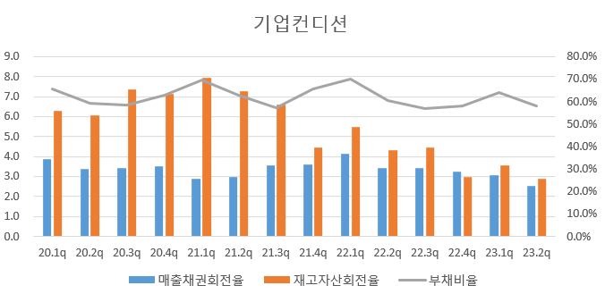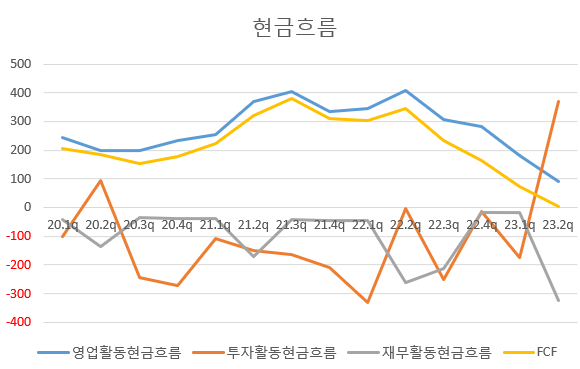 영업활동현금흐름과 FCF가 계속 +이고 23년 2분기 역시 +이지만 계속해서 감소세이다. 23년 3분기엔 현금흐름이 -로 돌아설까. 그렇다면 올해 현금흐름이 +라 하여도 좋은 모습은 아니다.
