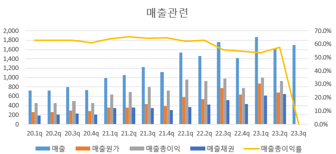 분기분석의 초점은 20~22년 코로나로 인한 골프산업 호황의 영향이 지나간 이후의 실적은 과연 어떨까에 대한 고민이다. 아래의 내용은 공시에 따른 23년 3분기 일부 실적이 포함되었다.