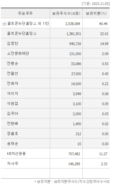 먼저 골프존의 주요주주를 살펴보자. 지주회산인 골프존뉴딘홀딩스가 22%, 대주주 김영찬이 15%, KB 자산운용이 11%, 자사주가 2%이다.