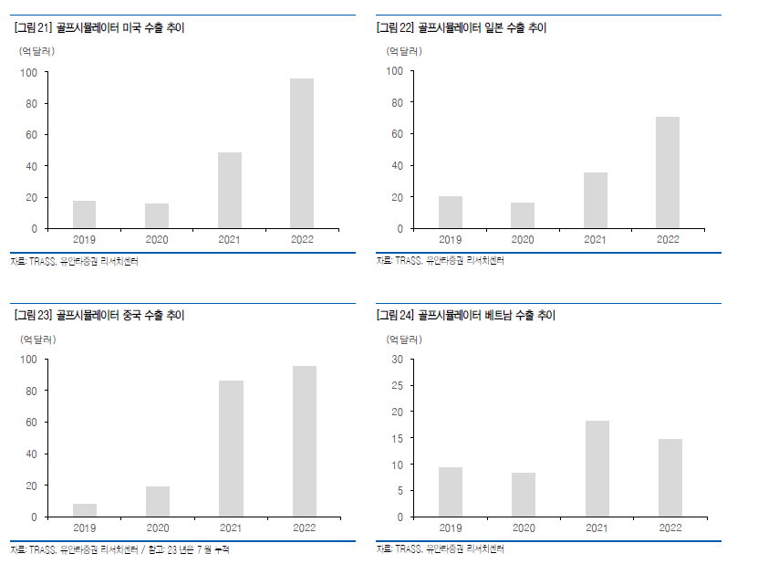 골프 시뮬레이터 수출 추이는 베트남을 제외하곤 증가세이다. 다만 위의 그래프는 단위가 좀 이상하다. 100억 달러면 10조가 넘는데 그건 아닌 것 같고.. 잘 모르겠다. 골프시뮬레이터 전 기업의 수출량인지, 골프존만의 수출량인지. 단위가 이상하지만 일단 골프존만의 수출 데이터로 생각하고 추세만 참고하기로 한다.