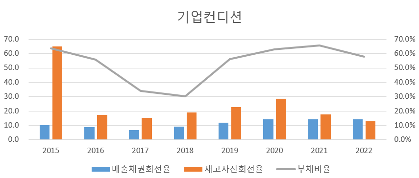 매출채권 회전율도 큰 변화가 없고, 부채비율도 60%전후로 나쁘지 않은데 재고자산 회전율이 계속 감소세이다. 재고자산은 증가하는데 재고자산회전율이 감소하는 건 좋지 못한 징조이다. 매출에 비해 재고자산이 증가하고 있다는 의미니 말이다.