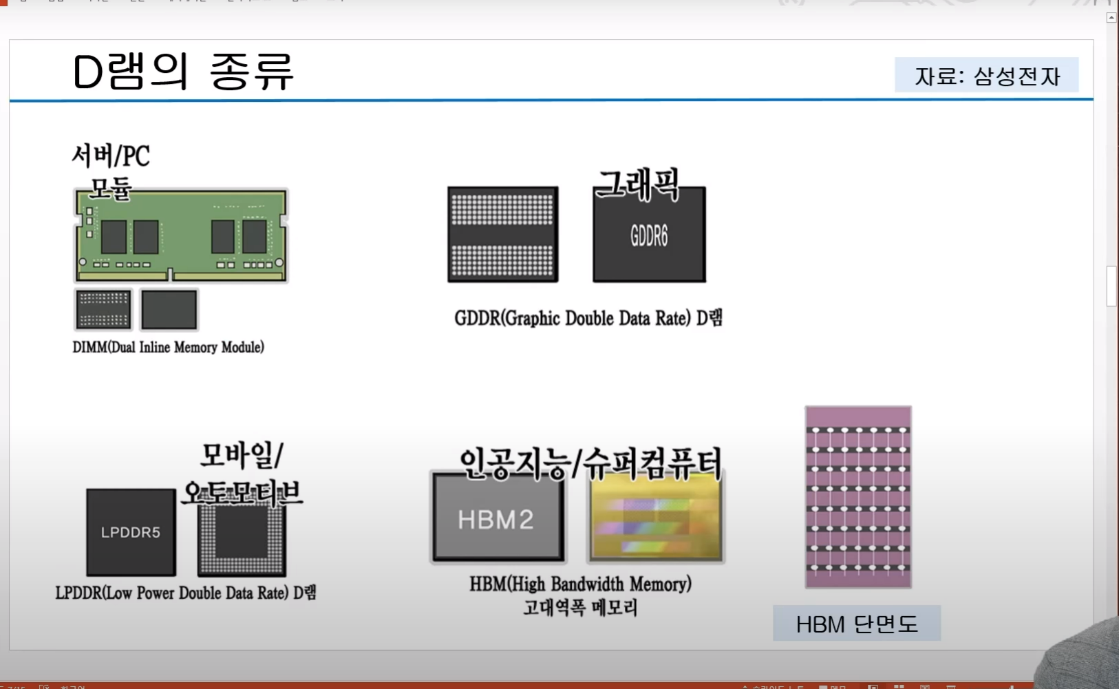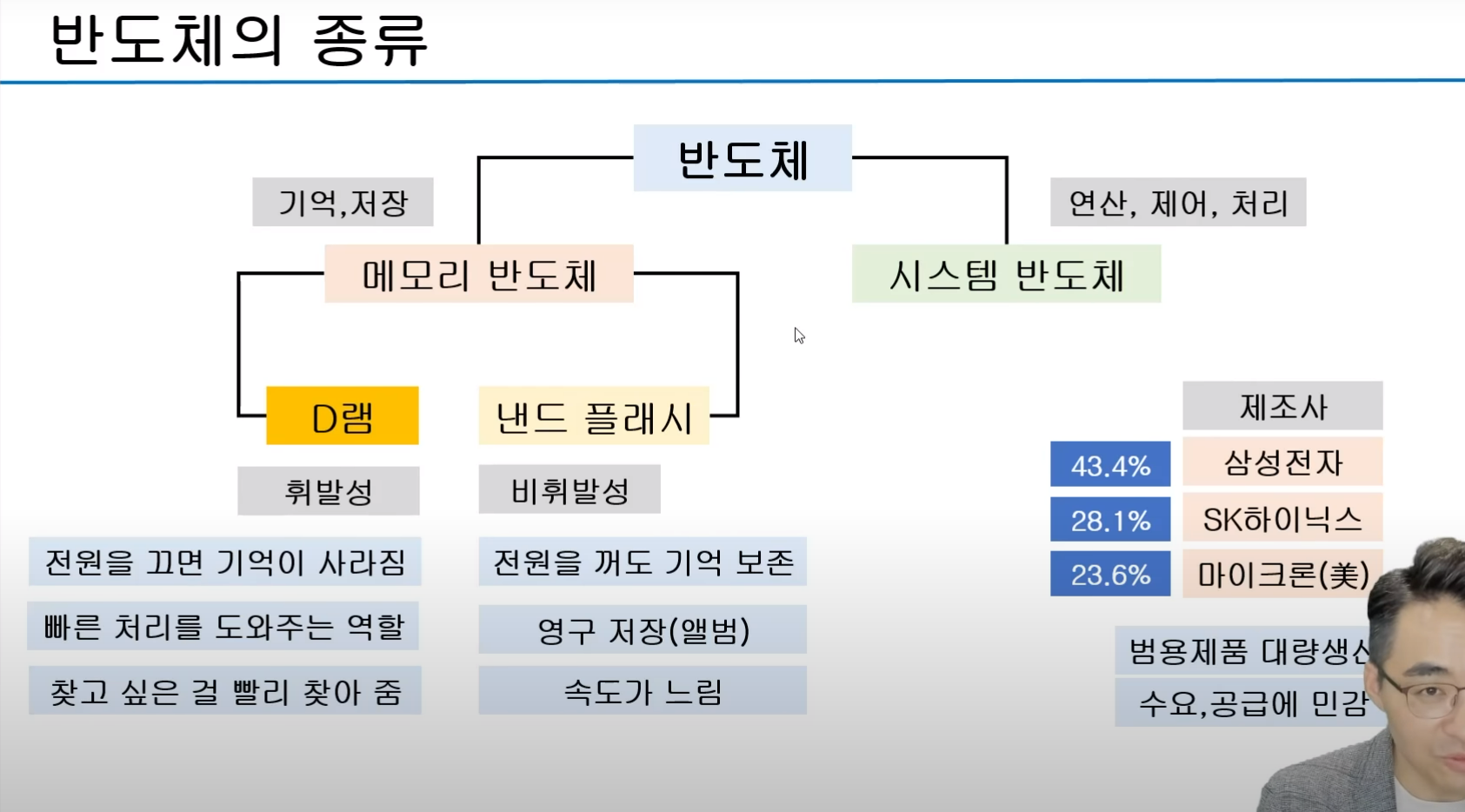 - 우선 볼 것은 메모리 반도체, D램은 단기 기억, 낸드는 영원히 저장됨. D램이 많으면 처리 속도가 빨라짐