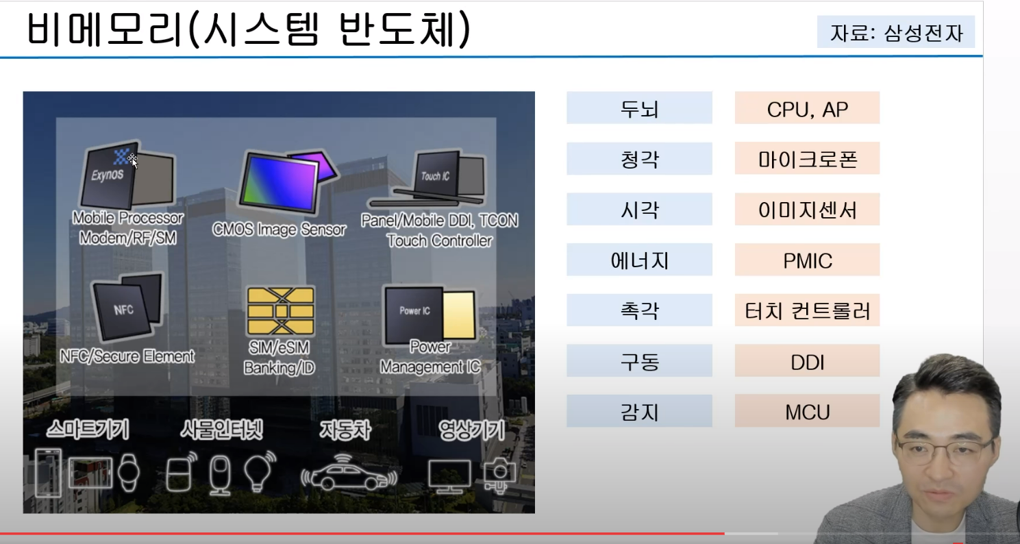 - CPU 피씨에 들어가는 연산을 하는 것, MCU 센서 같은것, Modem 통신, GPU 그래픽카드, DDI 디스플레이를 구동시키는 팁, CIS는 카메라에 들어가는 센서, AP는 앞의 것을 다 포함