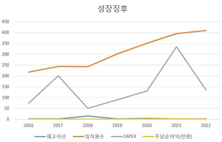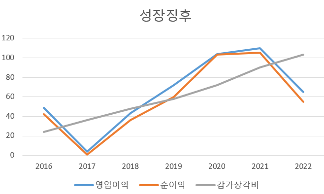 이익은 증가세이나 꺾였다. 21년에 capex투자가 있었고 그에따른 비용이 들어갔으리라 추정