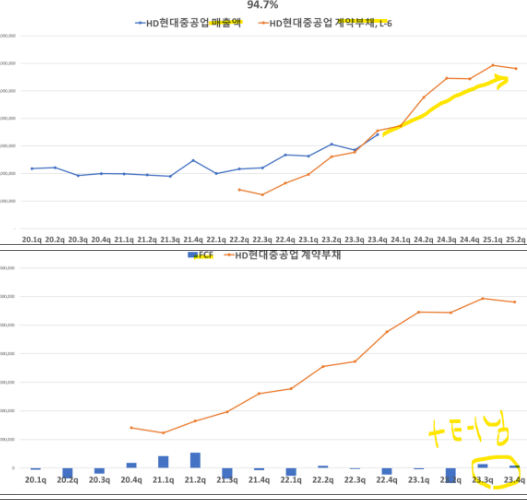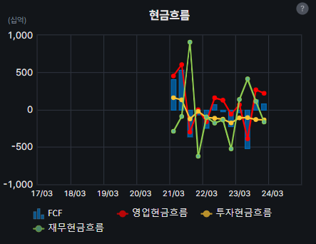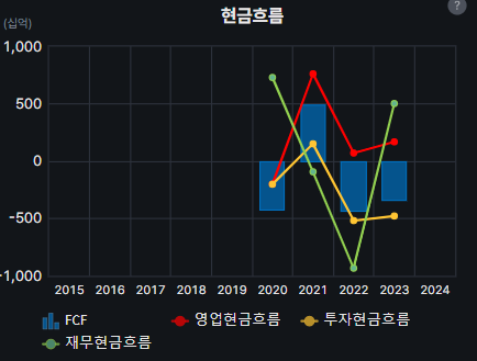 현금흐름은 연 기준으로보면 잉여현금흐름이 -이나 분기로 보면 +로 전환된 것을 볼 수 있고 영업현금흐름은 연 단위로 봐도 +이다