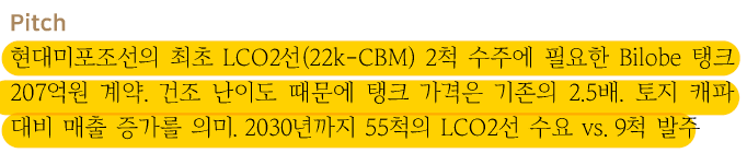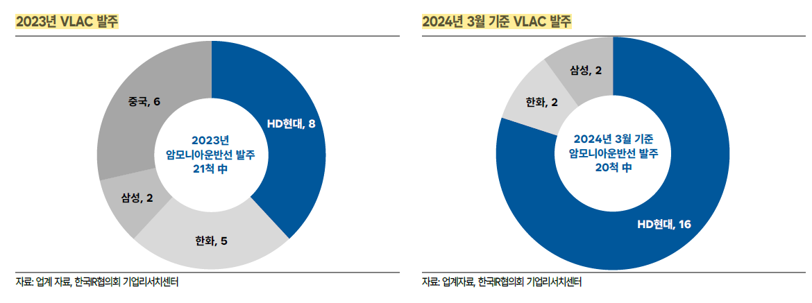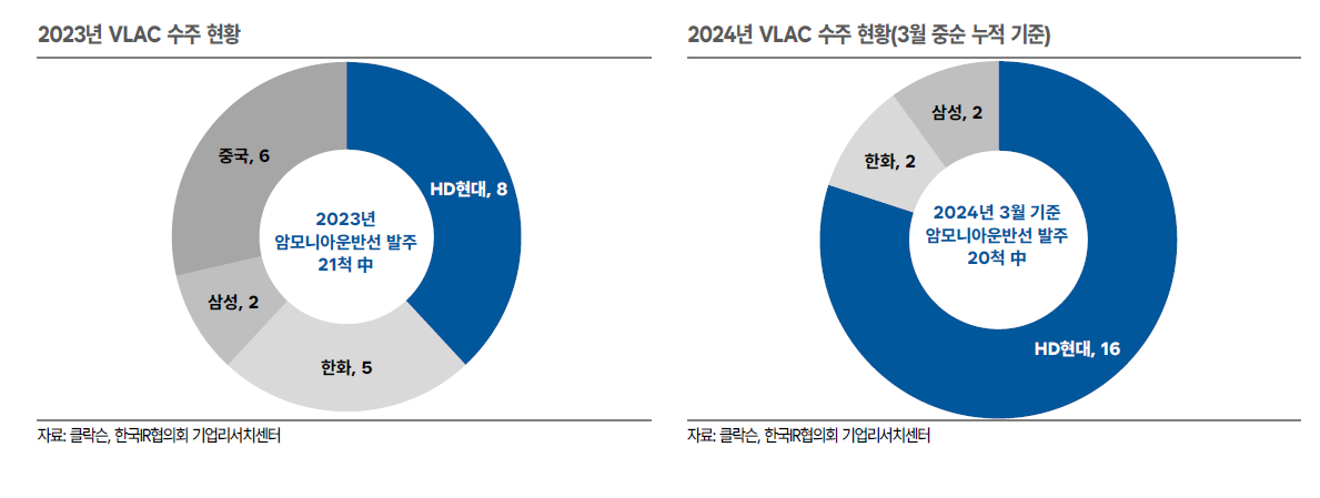 동사가 암모니아 Tank 시장의 최대 수혜업체라는 점은 2023년 하반기부터 2024년 3월 중순까지 발주된 41척 (2023년 21척, 2024년 3월 중순 누적 20척)의 VLAC(초대형암모니아운반선) 中 85%인 35척(현대 24척, 한화 7척, 삼성 4척)을 국내 조선 3사가 수주하였으며, 특히 동사의 주요 LPG 탱크 고객사인 HD한국조선해양이 전체 VLAC 발주의 58.5%인 24척(2023년 8척, 2024년 3월 중순 누적 16척)을 수주하여 동사의 암모니아 탱크 수주 기대감이 크기 때문이다. 특히 2024년 들어 HD한국조선해양은 전체 20척의 발주척수 중 80%인 16척을 수주하여 글로벌 VLAC 시장에서 압도적인 수주경쟁력을 보이고 있다.