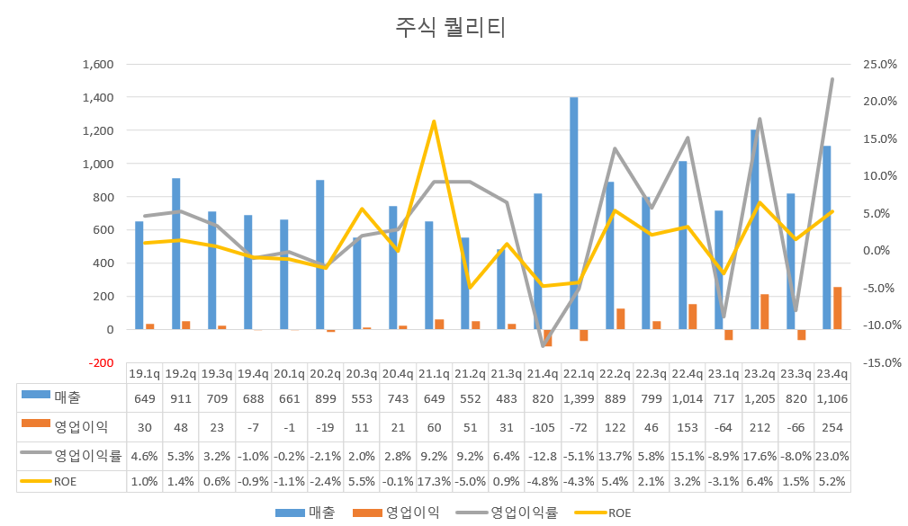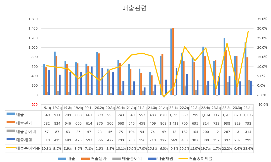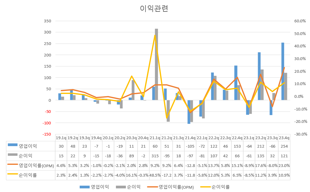 매출은 23년에 좀 줄었다지만 이익과 이익률이 급증, 업계 특성상 꾸준히 숫자가 찍히는 것이 어려울 수 있으니 앞으로 나오는 숫자에 집중하면 될듯