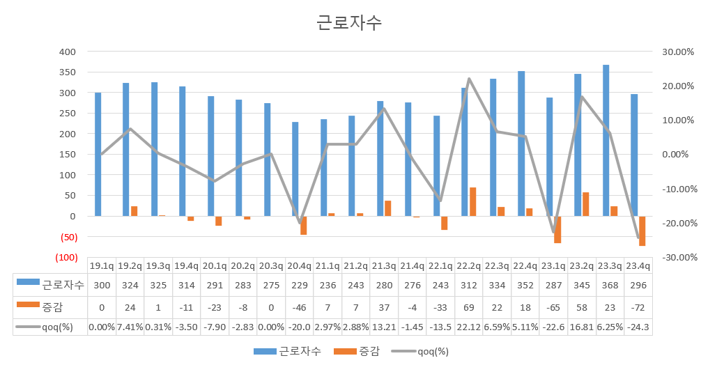 근로자수가 줄었다 늘었다 변동이 심한 이유는 무었인가? 점점 쌓여가는 수주잔고를 보면 꾸준히 인원이 늘어야 되는 것 아닌가? 퇴직금때문?