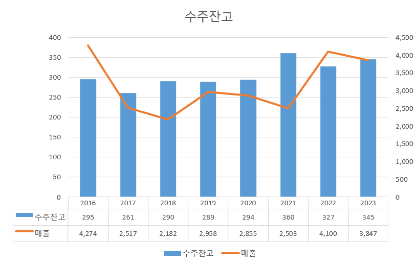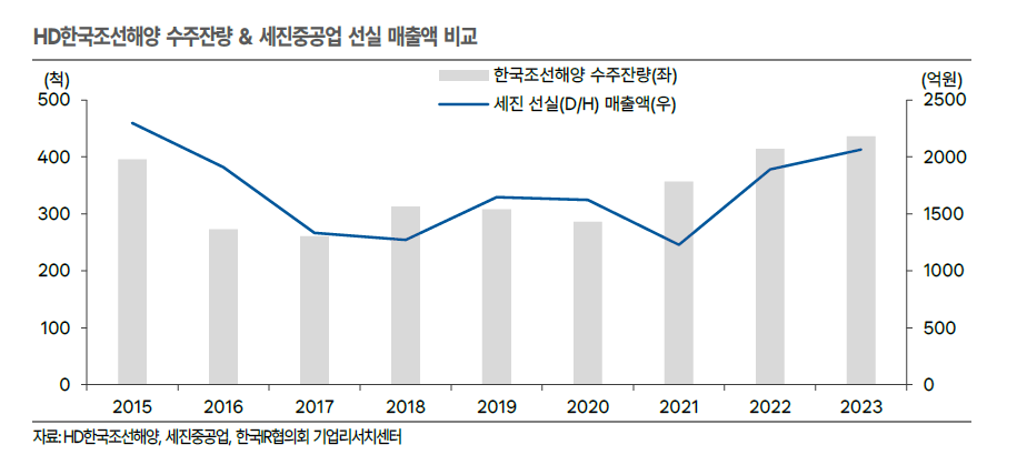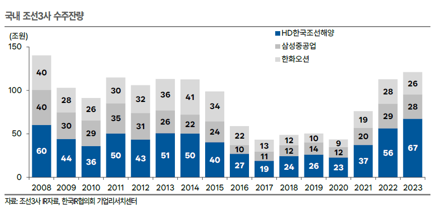 2021년을 정점으로 최근 2개년 연속 국내 조선 수주는 감소하였으나, 국내 조선3사의 수주잔고는 120.8조원으로 전년 대비 7.3% 증가해 2008년 이후 15개년 최대치를 경신하였다. 조선 3사 중에서는 특히 HD한국조선해양의 수주잔고가 2023년말 67.3조원으로 전년대비 19.7% 급증하며 2008년 수준(60.3조원)을 상회하는 역대 최대치를 경신하였다. 삼성중공업의 수주잔고는 27.9조원으로 전년대비 2.3% 감소하고, 한화오션은 25.7조원으로 7.8% 감소하였다.