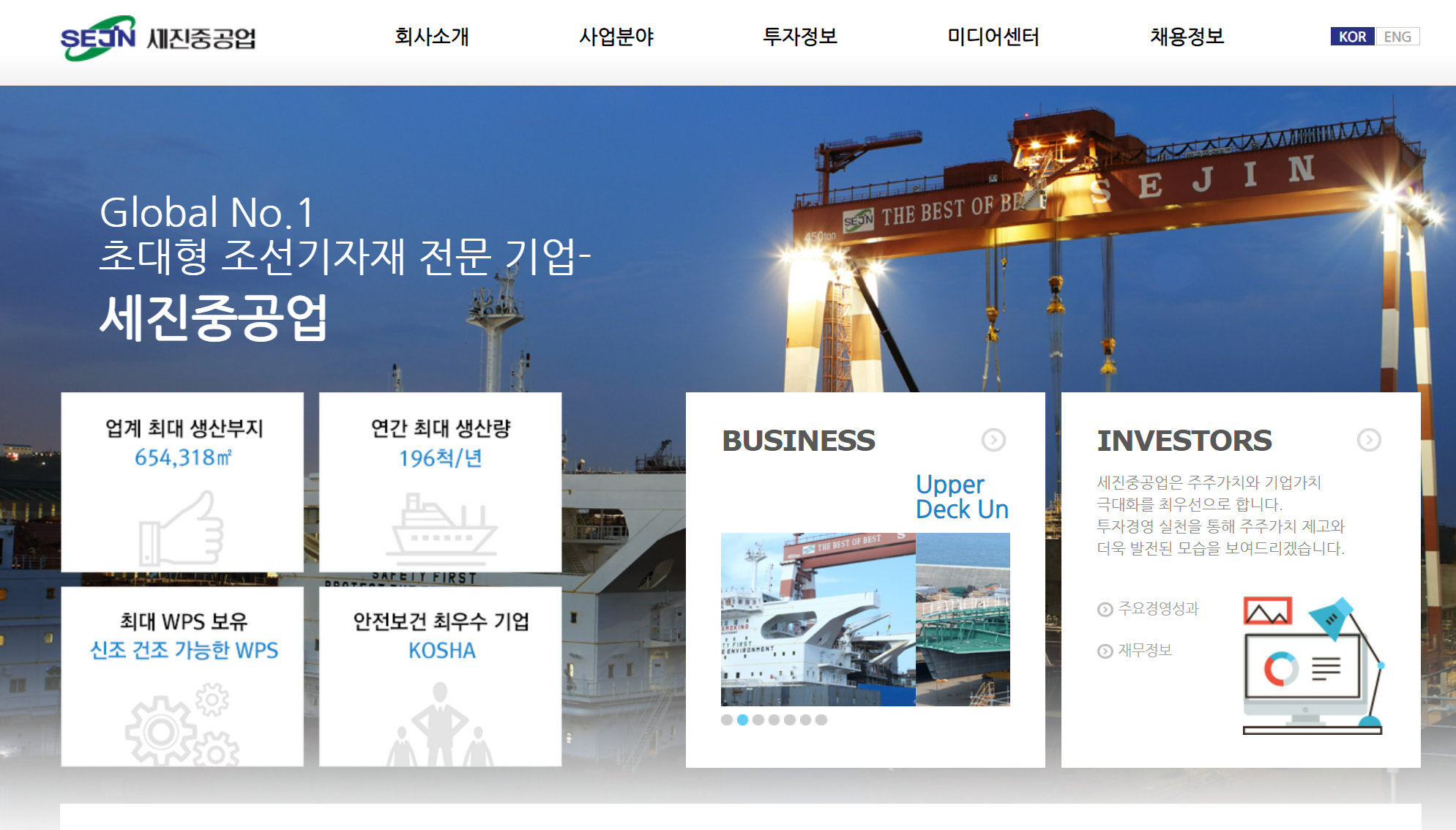 세진중공업 홈페이지에 접속하면 가장 먼저 뜨는 것이 협력사 모집 공고입니다. 모집 분야는 선각·의장·도장 등으로 동종업계(직종) 유경험 협력사를 찾고 있는 것으로 확인됐습니다. 최근 조선업 수주량이 늘면서 세진중공업도 일손 부족 해결을 위한 협력사를 찾고 있는 것으로 보입니다.