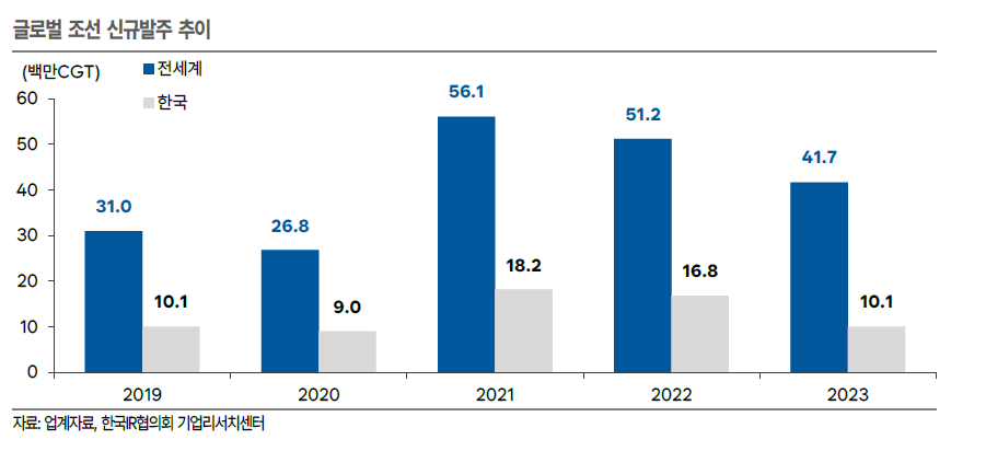 글로벌 조선 신규발주는 21년을 고점으로 줄어들고 있다. 한국의 수주 감소는 2021~2022년 컨테이너선 및 LNG선 수주 증가로 이미 3~4년치 일감을 채워 고부가 위주 선별 수주에 나서면서 아직 생산여력이 있는 중국업체들이 수주를 적극 늘렸기 때문이다.