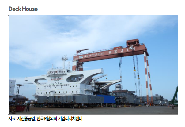 Deck House는 선박에서 선원들의 주거 공간이자 항해 및 통신 시설을 효과적으로 사용하기 위한 공간으로, 선종에 관계없이 반드시 장착되어야 한다. 이는 선실, 조정실, 선원들의 휴게실 등의 편의시설로 구성되어 있어 선체 모든 공정의 집합체라고 불리며, 이를 만들기 위해서는 고도의 기술력과 노하우를 갖추어야 한다. 동사는 Deck House 생산에 있어서 국내에서 독점적인 위상을 갖고 있다. 2004년 초도품을 납품한 이래 20년간 누적 공급규모는 1,495척에 달한다. 국내시장 점유율은 약 33%이며, 2023년 납품규모는 약 110척으로 추정된다.