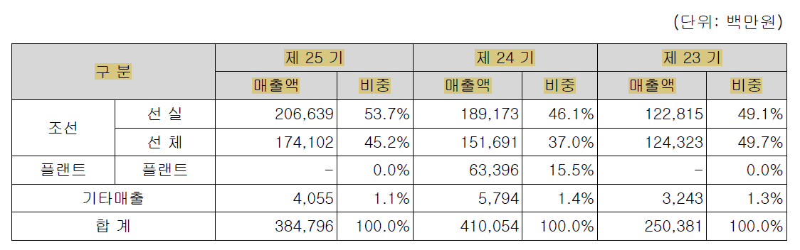 주요 매출은 데크하우스 53%, 선체 45%(주로 LPG 탱크) 이다. 데크하우스와 엘엔지탱크에서 글로벌 1위 조선기자재 업체이다. 국내에서 유일하게 암모니아 탱크를 납품한 이력이 있고, LNG탱크도 제작 가능하다. 동사는 초대형 조선기자재 시장에서 핵심경쟁력으로 꼽히는 약 20만평(65.4만㎡)인 국내 최대 규모의 넓고 평탄한 생산부지를 갖추고 있다. 주요 고객사는 현대미포조선, 현대중공업등 현대 계열 조선사이다. 울산지역 HD한국조선해양(HD현대중공업, 현대미포조선)에 소요되는 Deck House와 LPG Tank는 거의 100% 동사가 공급하고 있으며, 초대형 조선기자재를 만드는데 필요한 후판은 현대중공업이 무상사급1 으로 공급하고 있다. 이는 선박 건조에 2~3년의 긴 리드타임이 필요해 원자재 가격변동 리스크에 노출되기 마련인 조선업종에서는 안정적인 수익성을 담보하는 요인이다.