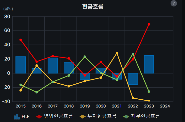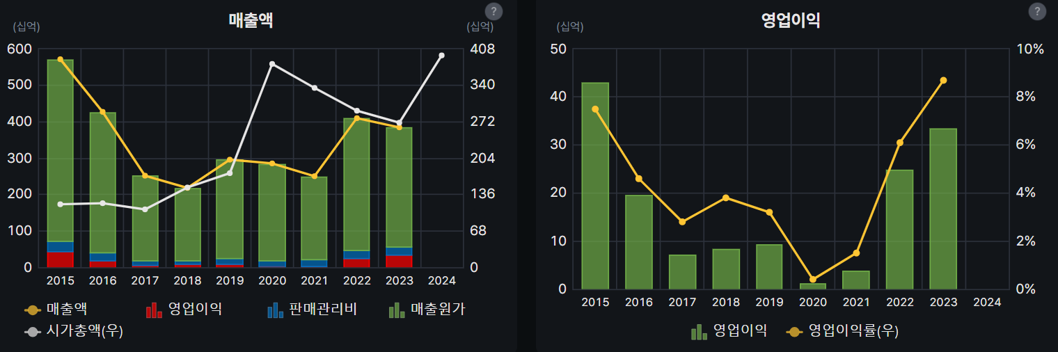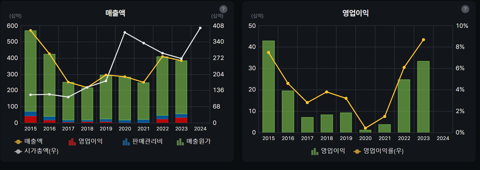 바로 위 그림에서 보다시피 23년도에 매출은 감소했으나 이익 및 이익률은 급격히 올라가고 있는 모습을 볼 수 있다.