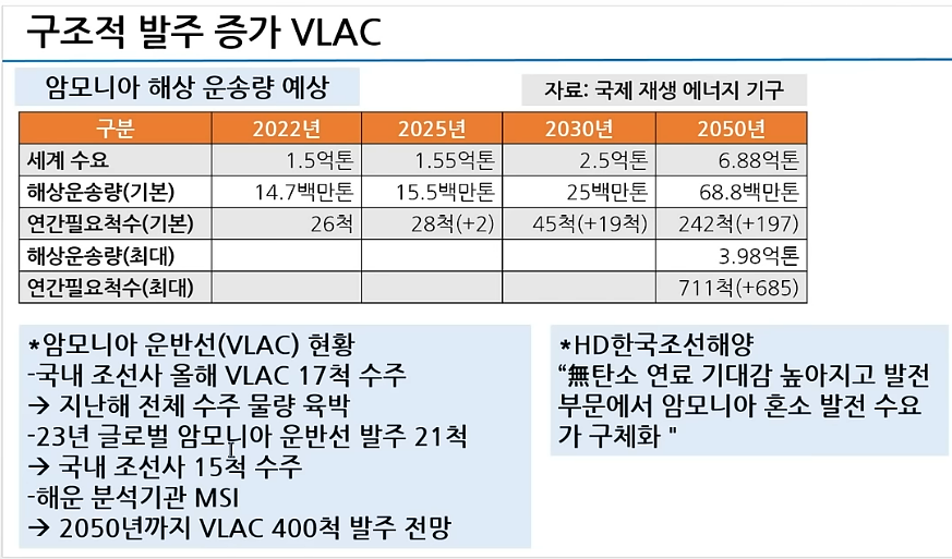 모니아 수출규모가 2030년까지 3천만톤, 2050년까지 3억톤으로 증가할 것으로 전망하고 있으며, 향후 VLAC 수요는