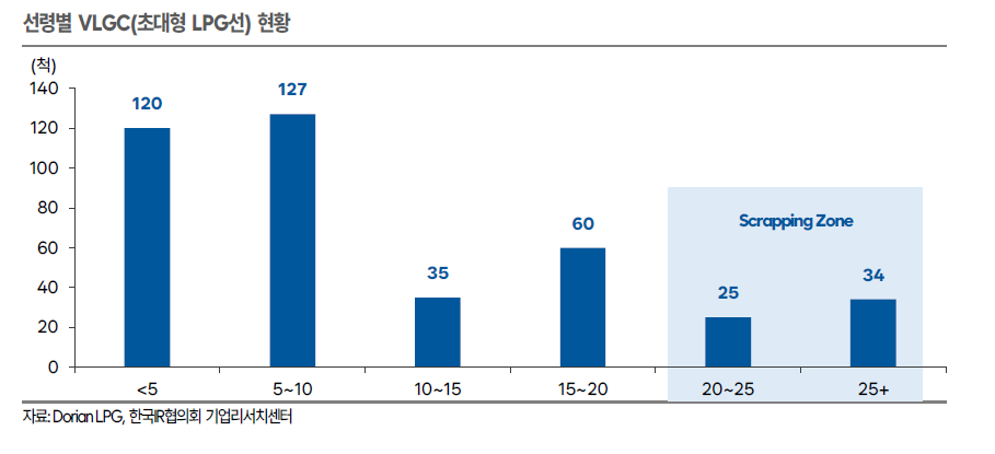 기준 약 401척의 VLGC 선대 중 20년 이상 노후 선박은 59척으로 약 15%가 Scrap 이후 교체수요가 발생할 것으로