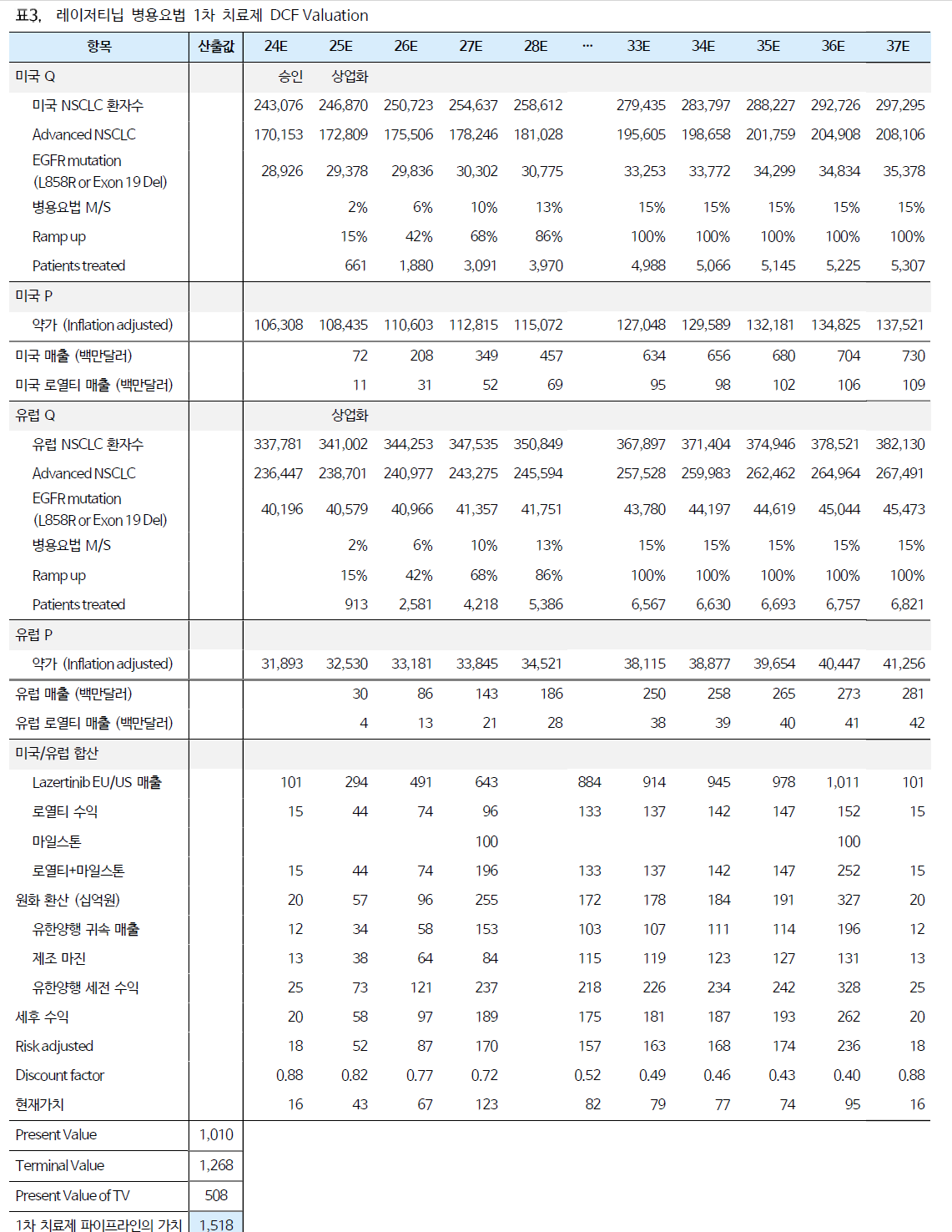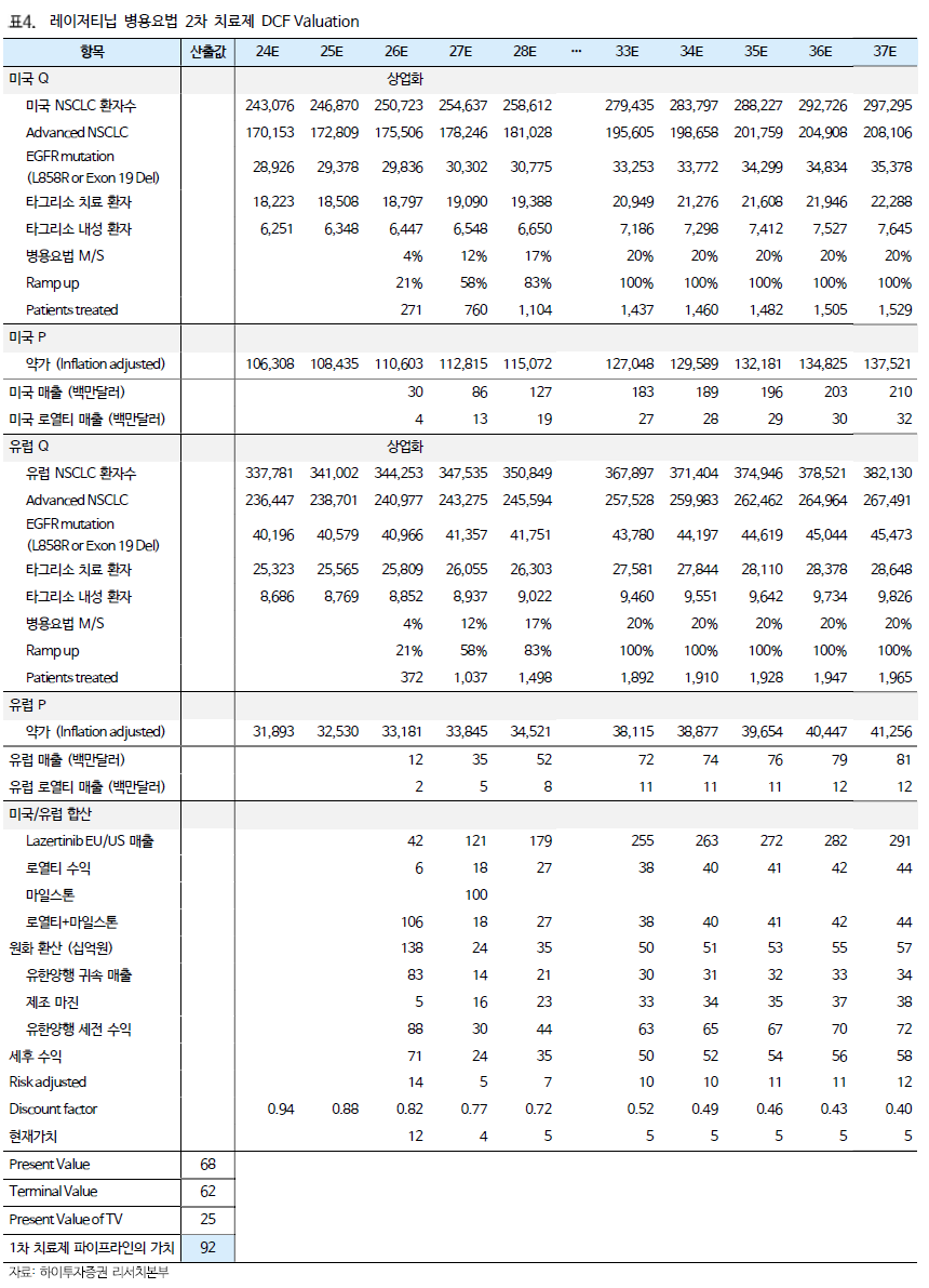 -> 레이저티닙 1차 치료제는 24년 세전 250억 이익 예상, 25년 730억, 26년 1210억 예상. 23년 영업이익이 568억이니 이것 만으로도 엄청난 이익인듯, 실제 찍힐지와는 별개의 문제로
