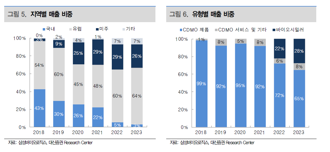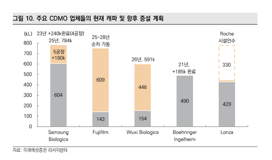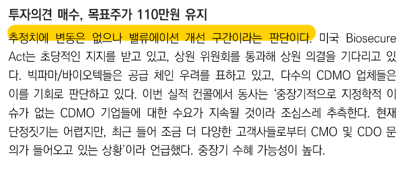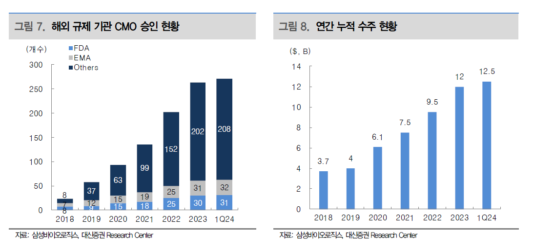 글로벌 항체의약품 CDMO 수요는 1) 기존 약물의 적응증 확대, 2) ADC, 이중항체 등 신규 모달리티 개발 증가, 3) 기존 CMO 공장 설비 노후화로 견조할 전망. 론자의 로슈 공장(33만L) 인수는 항체의약품 수요 증가에 대응하기 위함으로 추정. 동사는 그동안 쌓아온 Track record 및 빅파마 네트워크를 바탕으로 적극적으로 5공장 수주 활동 진행중. 바이오시밀러 개발 및 출시 준비도 순조롭게 진행중. 1) SB17(스텔라라bs) 유럽 및 국내 품목허가 승인, 2) SB27(키트루다bs) 임상 1상/3상 개시, 3) B12(솔리리스bs), SB15(아일리아bs) 국내 품목허가 승인.