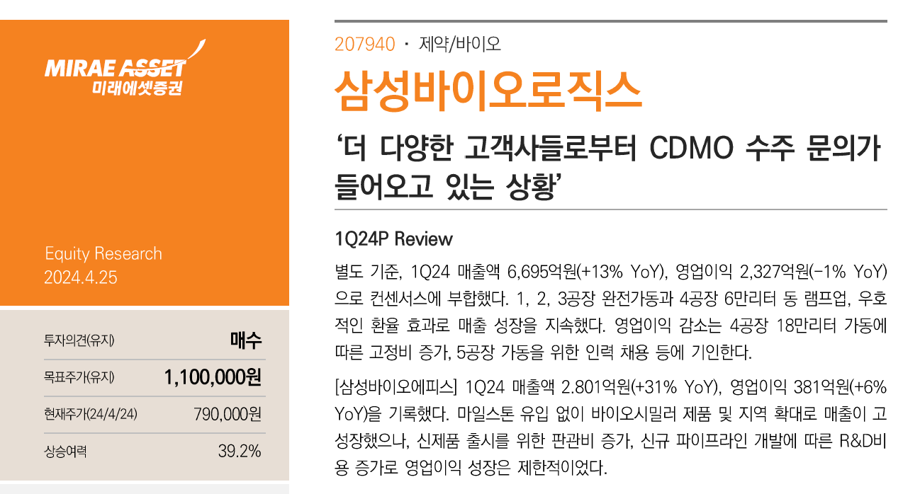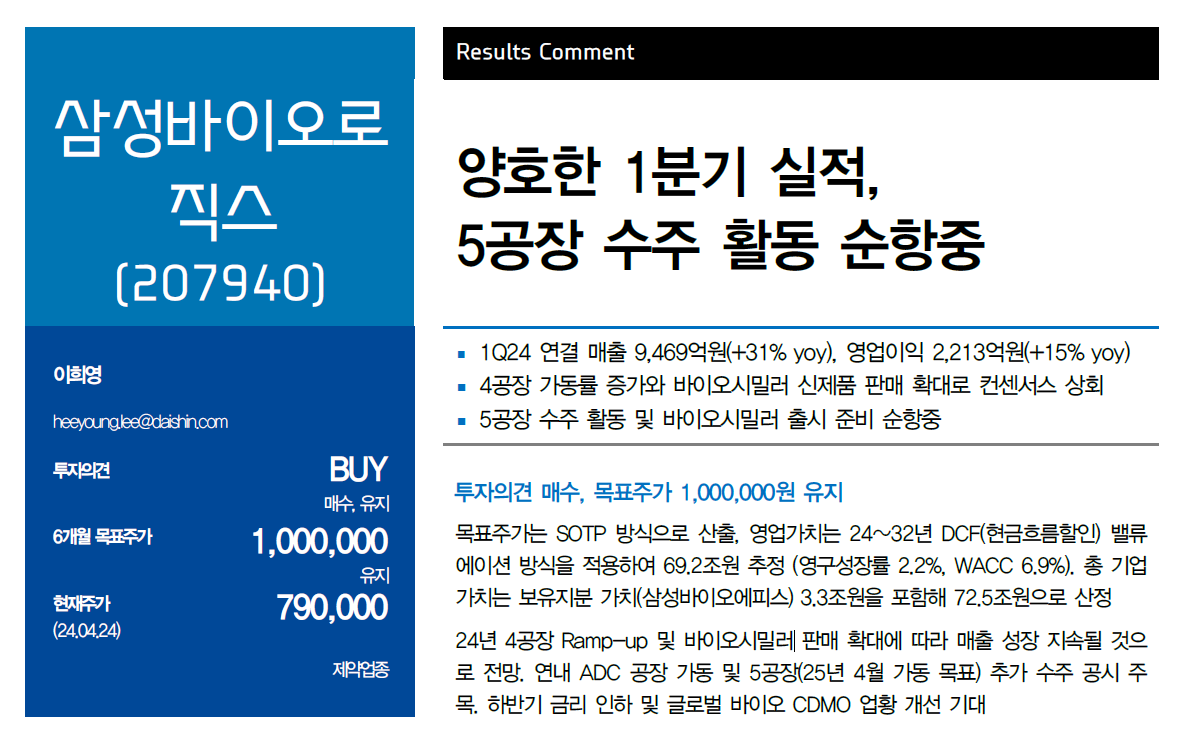 24년 4공장 Ramp-up 및 바이오시밀러 판매 확대에 따라 매출 성장 지속될 것으로 전망. 연내 ADC 공장 가동 및 5공장(25년 4월 가동 목표) 추가 수주 공시 주목. 하반기 금리 인하 및 글로벌 바이오 CDMO 업황 개선 기대
