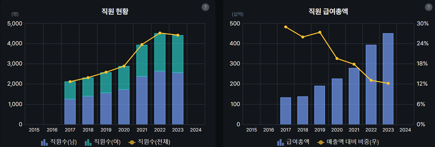 매출은 늘었지만 직원수는 감소, 근데 직원 급여총액은 쭉 늘고 있음. 나만 매출대비 급여가 줄고 있음