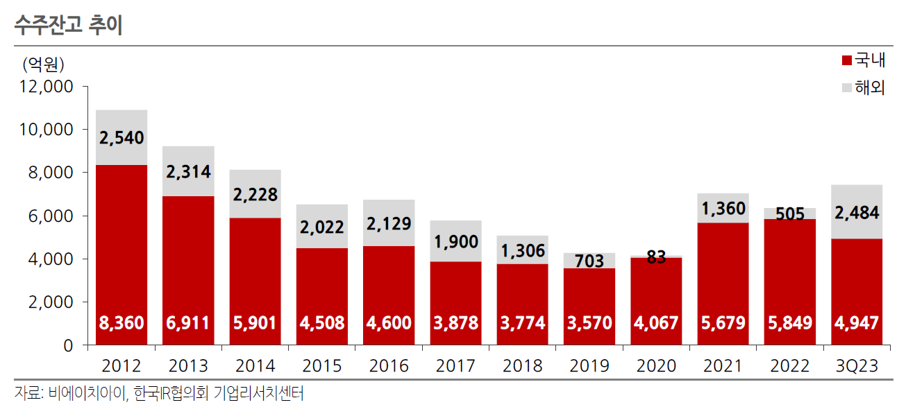 3Q23 수주잔고는 7,039억원으로 2014년 이후 7년만에 7천억원대 회복, 연내 추가 수주를 감안하면 2014년 수주잔고 상회 예상