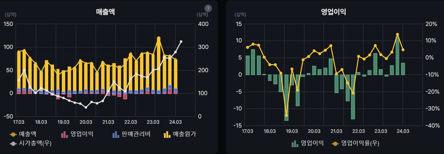 연도별로 보면 매출증가, 영업이익 및 영업이익률이 증가하는 모습을 보여주고 있다