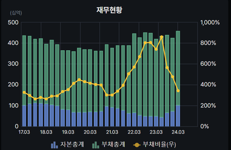 부채비율이 높다. 원랜 800% 정도로 더 높았지만 지금은 400%로 낮아(?)졌다. 하지만 400% 라는 숫자는 높은 숫자이다. 그리고 이 부채비율이 낮아진 이유가 전환사채가 행사되어 주식으로 바뀌었다는 점에 문제가 있다. 회사와 동행하는 것이 아닌 이익을 보고 팔아버리려는 오버행 이슈가 있다는 것이 이 종목의 큰 단점이다.