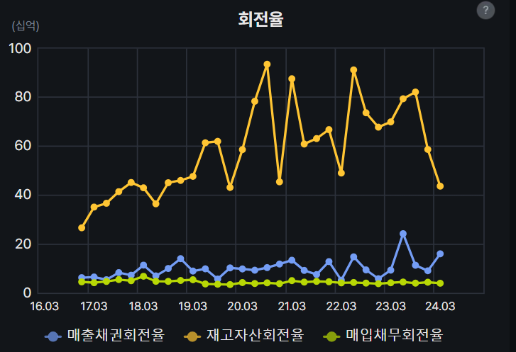 최근 재고자산회전율은 감소세이나 기존을 보니 좀 등락이 있는 것 같아 플랫하다고 얘기할 수도 있다고 생각한다. 매출채권회전율은 플랫하다