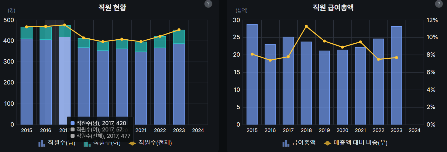 임직원수 상승중, 급여총액도 상승 중 성장하고 있는 모습이 보인다.