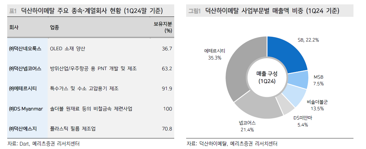 통상적으로 동사 별도 본업 실적은 FC BGA 업황과 연동 이는 동사의 상대적 고마진 제품인 MSB(마이크로솔더볼) 매출이 FC BGA 출하와 연동되기 때문 다만 1 Q24 는 MSB 매출이 QoQ 감소했음에도 불구하고 큰 폭의 이익 성장을 기록 이는 1) 국내 고객사향 DDR5 물량을 대응하던 경쟁사의 솔더볼 사업 철수로 인해 동사 물량이 증가했기 때문 동사가 특허를 가지고 있는 고순도 제품으로 물량을 대체함에 따라 수익성도 동반 상승 2) 기존 공급하던 Paste4~5 제품이 아닌 반도체 범핑용으로 사용되는 Paste7 제품 매출이 신규로 발생 통상적으로 Paste 는 뒤에 붙는 숫자가 높을수록 입자가 작기 때문에 기술적인 난이도가 높고 고마진 제품으로 분류 1) 과 2) 모두 일회성 요인이 아니기 때문에 동사 별도 본업의 높아진 이익체력이 향후에도 유지될 전망