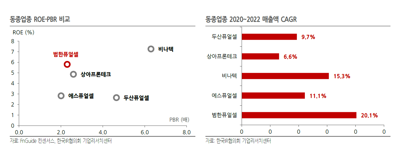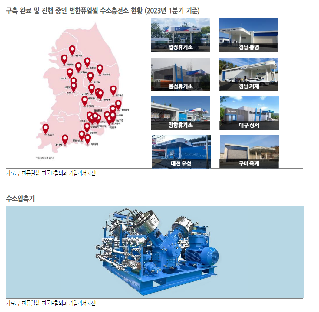 수소충전소 구축 사업은 EPC(Engineering, Procurement and Construction)로, 주문을 받아서 설계, 구성품 조달, 인허가 및 건설, 검사를 거쳐 수소충전소를 운영할 수 있는 상태로 납품하는 사업,수소충전소 구축의 핵심부품인 수소압축기는 원가의 50% 이상 차지하는데, 동사는 모회사 범한산업으로부터 국산화한 수소압축기를 공급받고 있음. 국내 시장점유율은 약 10% 초반을 차지. 정부는 2023년 수소충전소 86개소 사업공모계획(사업 예산 1,896억원)을 밝혔으며, 2030년까지 국내 수소충전소를 660개소를 구축할 계획. 동사의 수소충전소는 총 29개소로, 현재 18개소 구축을 완료했으며, 11개소 구축을 진행 중. 또한 동사는 기존 기체수소충전소에서 향후 액화수소충전소로 사업영역을 확대할 계획. 액화수소충전소는 고부가 미래형 사업으로 기존 기체형 수소충전소보다 수주금액이 2.5~5배 높다. 정부는 2023년부터 상용차용 액화수소충전소 수주도 진행할 예정. 동사는 점유율 가정時 8~10개소 내외 수주가 가능할 전망.