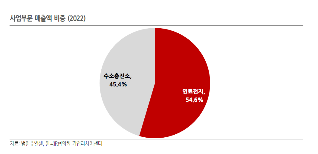 범한퓨얼셀은 2019년 범한산업의 수소연료전지 사업부를 물적분할하여 설립된 기업, 1) 잠수함용 및 건물용 연료전지 제조와 2) 수소충전소 구축 사업을 영위 동사는 경쟁업체가 모방 불가한 모빌리티용 연료전지 기술 을 보유하고 있음, 우리나라 해군에 잠수함용 연료전지를 공급한 국내 유일 기업으로 2004년 독일의 지멘스 이후, 2014년 세계 두번째로 잠수함용 연료전지 상용화에 성공. PEMFC(Polymer Electrolyte Membrane Fuel Cell, 고분자 전해질막 연료전지) 방식의 연료전지를 생산, 소형 발전용 연료전지로 사업을 확장. 모회사 범한산업의 수소압축기 자체 생산기술을 바탕으로 수소충전소 구축사업에 진출, 2023년 1분기말 기준 수소충전소 29개소를 수주해 18개소를 구축하고, 11개소는 진행 중. 2022년 사업부문의 매출 비중은 1) 연료전지 공급 54.6% 2) 수소충전소 구축 45.4%. 신사업으로 선박용 연료전지, 수소버스 및 건설기계 사업을 진행 중, 차세대 연료전지 SOFC 개발 사업도 추진.
