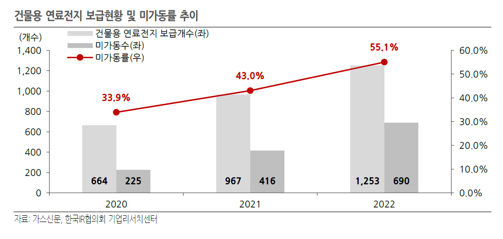 정부는 2040년까지 건물용 연료전지 보급규모 2.1GW로 확대 계획, 2022년말 기준 건물용 연료전지 보급대수는 1,253개로 YoY +29.6% 증가