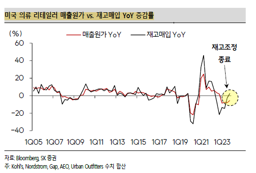 고객사의 재고조정 유무를 판단하는 가장 중요한 기준은 매출원가와 재고매입액 간의 괴리율이다. 미국 의류 리테일러들의 경우 ‘22 년 3 분기부터 두 지표 간의 괴리가 발생하기 시작해 ‘23 년 3 분기까지 이어졌으며, ‘23 년 4 분기에는 재고매입액의 증가율이 매출원가 증감률을 상회하면서 다시 Restocking 사이클로 진입했음을 확인할 수 있다.