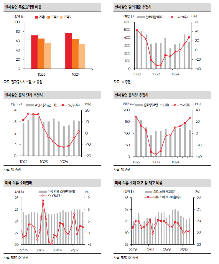 속도는 더디나 방향은 맞다. 시장 재고 부담 완화 (1Q24 미국 의류 소매판매 Re-stocking 전환), 주력 거래선 판매 회복 (GAP 매출 성장 전환), 달러 강세 기조, 주력 품목 (저가 캐주얼) 강세 모두 유효하다. 2Q24E 달러 매출 (+3.2%) 회복을 시작으로, 실적 턴어라운드가 본격화될 전망이다. 의류 업종 최선호주로서 제시, 매수 접근을 추천한다.