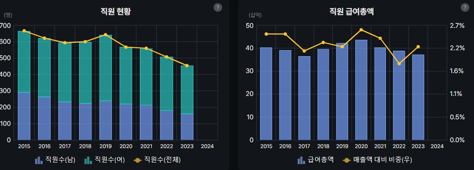 임직원이 줄었음. 매출 감소로 인한 것 같긴한데. 명수를 보면 외국 생산공장의 근로자는 미포함일듯. 이러한 인원 감축이 매출감소에도 영업이익을 지켜낸 요인이 되긴할듯. 외국 생산공장 근로자수를 파악할 수 있다면 이는 매출 상승의 선행지표로 볼 수 있을 것 같긴함.