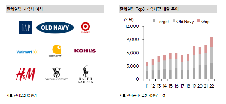 한세실업의 사업부는 의류 제조 단일 사업부로 구성되어 있으며, 고객사인 패션 브랜드로의 의류 제품을 위탁생산해 수출하는 OEM 사업을 영위하고 있다. 동사는 의류 제품 내에서도 니트(Knitted) 의류의 봉제 공정을 주로 담당하고 있으며, 30 개가 넘는 글로벌 브랜드를 고객사로 두고 있다. Gap, Old Navy, AEO 등의 미국 SPA 브랜드와 Target 과 Walmart 등 마트 바이어를 주력 고객사로 두고 있으며, 그 외에도 ‘Carhartt’, ‘Kohl’s’, ‘H&M’ 등 다양한 글로벌 브랜드의 의류제품을 생산하고 있다.